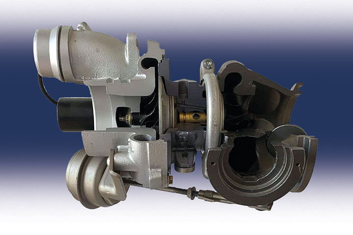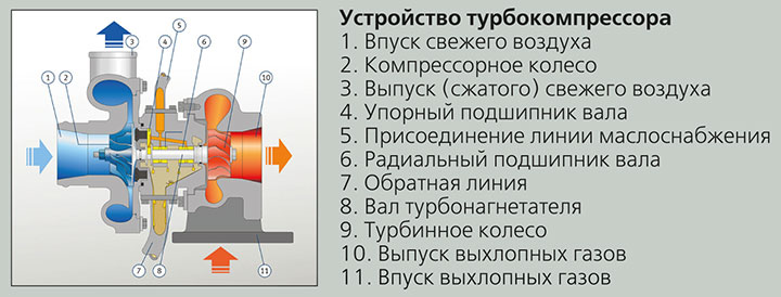 Выхлопные газы, образующиеся при сгорании топлива, приводят в движение турбину, которая соединена валом с крыльчаткой компрессора. Она сжимает всасываемый воздух и таким образом увеличивает количество воздуха, подаваемого в двигатель. Это позволяет минимизировать выбросы CO2 и сократить расход топлива, повысив производительность двигателя.